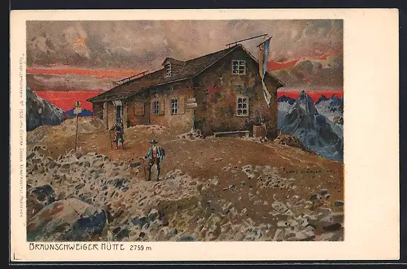 Künstler-AK Carl Schmidt: Braunschweiger Hütte mit Wanderern