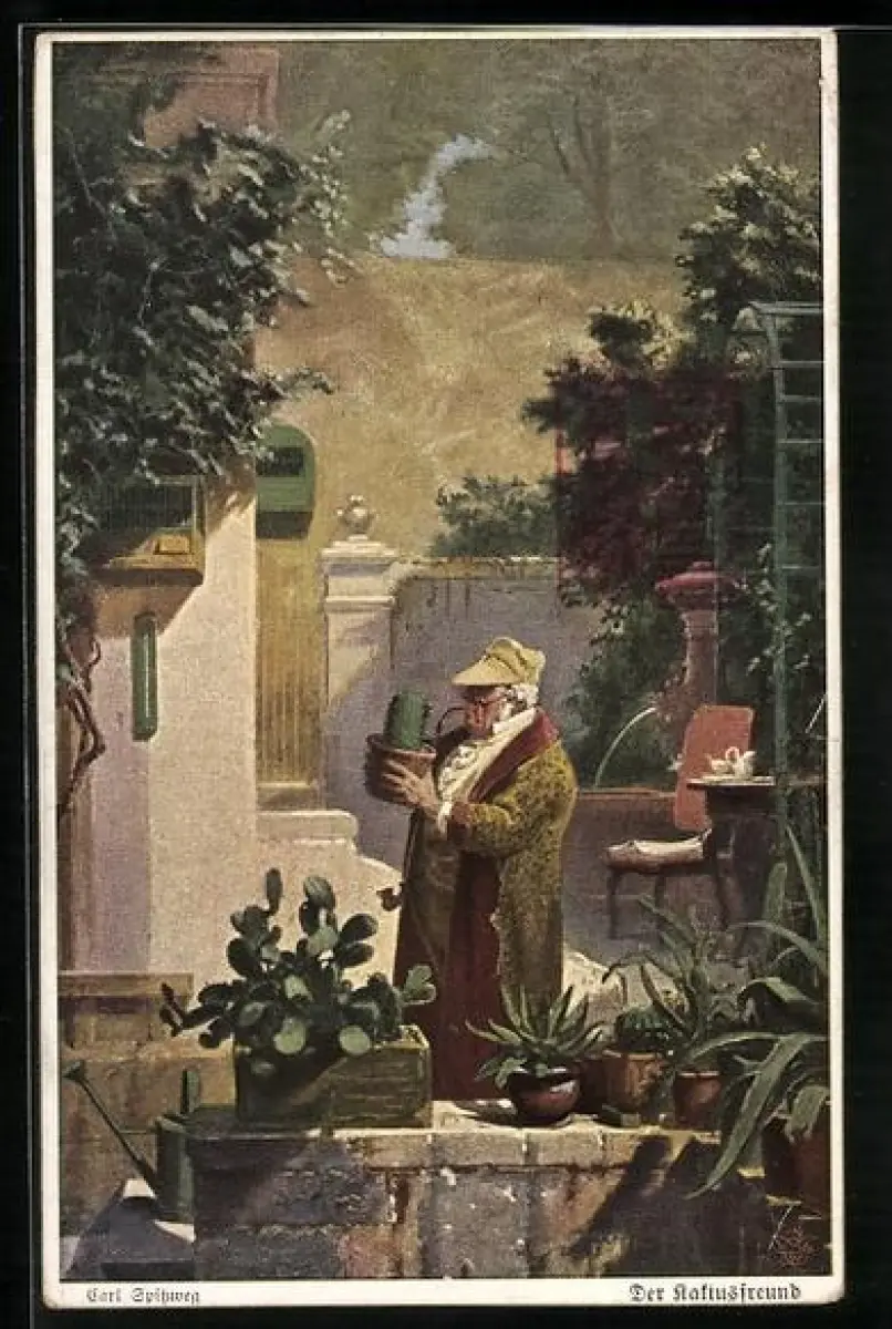 Künstler-AK Carl Spitzweg: Der Kaktusfreund, alter Mann inmitten seiner Kaktusblumentöpfe