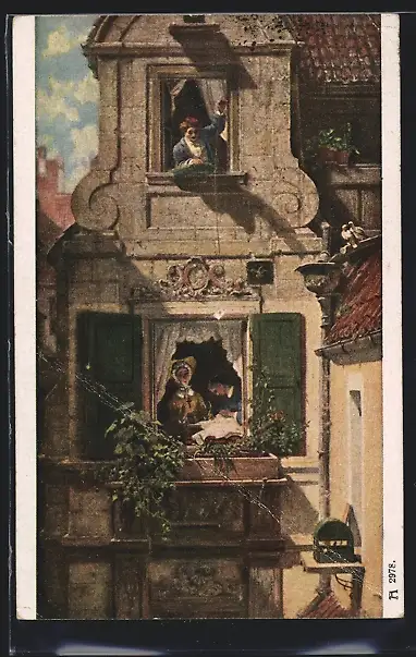 Künstler-AK Carl Spitzweg: Liebespost, Herr lässt einen Brief zu der Dame hinunter