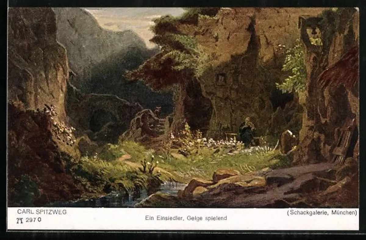 Künstler-AK Carl Spitzweg: ein Einsiedler spielt auf seiner Geige