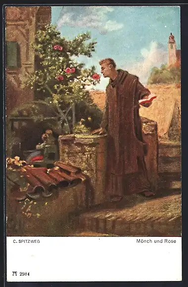 Künstler-AK Carl Spitzweg: romantischer Mönch riecht an blühenden Rosen