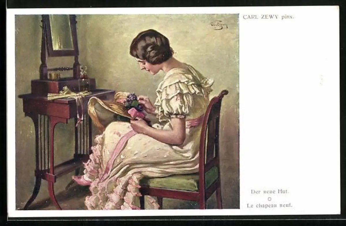 Künstler-AK Carl Zewy: Der neue Hut, Frau im Kleid sitzt auf einem Stuhl und näht einen Hut