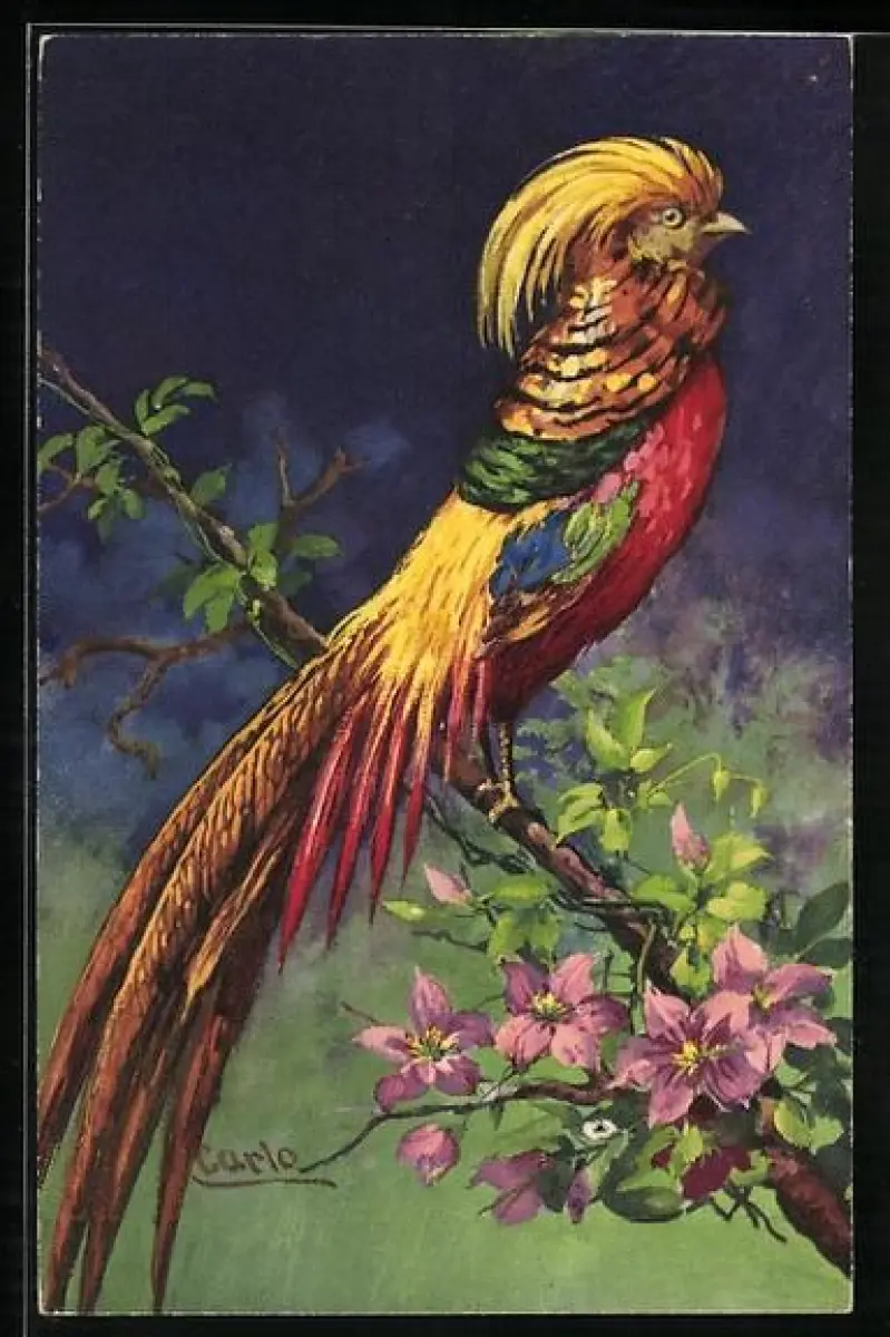Künstler-AK Carlo Chiostri: Vogel mit buntem Gefieder auf einem Ast sitzend