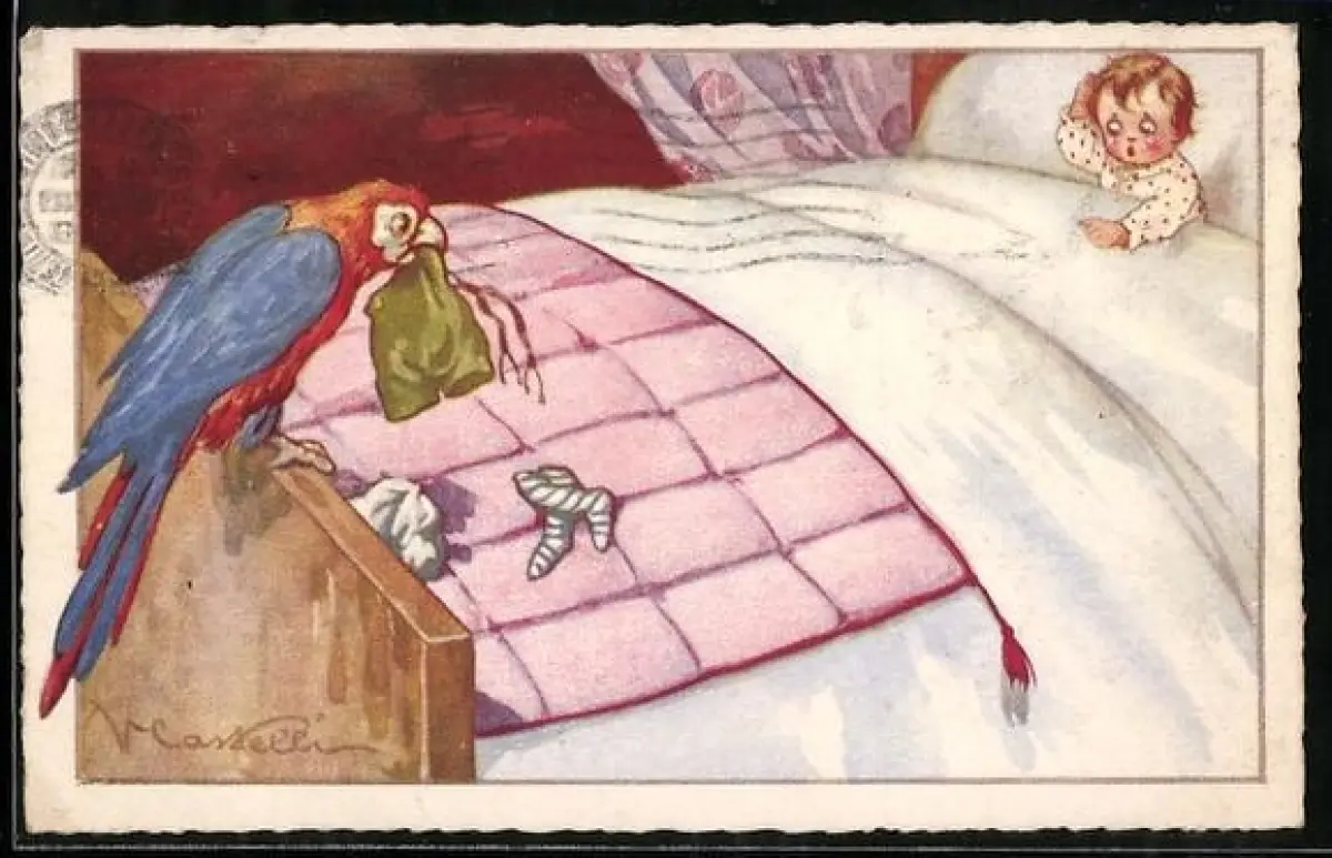 Künstler-AK Castelli: Kind wird von einem Papagei im Bett überrascht