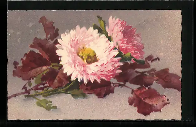 Künstler-AK Catharina Klein: Zwei rosa-weisse Chrysanthemen mit herbstlichen Blättern auf grauem Hintergrund