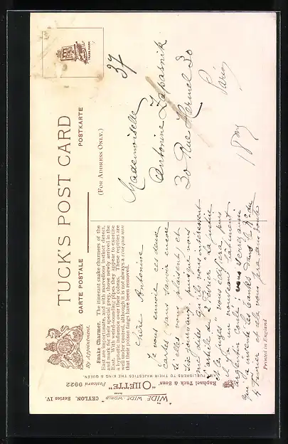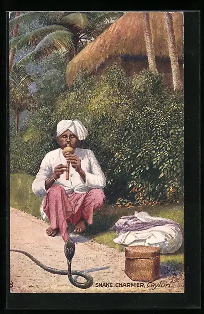 Künstler-AK Ceylon, Schlangenbeschwörer mit einer Flöte und Korb