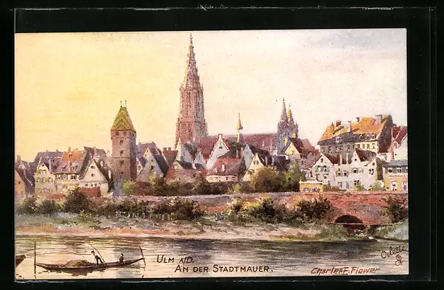 Künstler-AK Charles F. Flower: Ulm / Donau, Ortspartie an der Stadtmauer, Boot