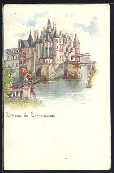 Künstler-AK Chenonceaux, Château de Chenonceaux et son reflet dans l`eau