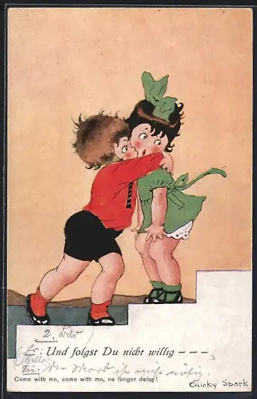 Künstler-AK Chicky Spark: Junge umarmt erschrockenes Mädchen