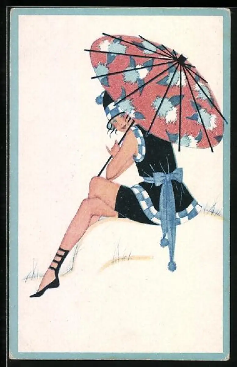 Künstler-AK Chicky Spark unsign.: Dame im kurzen Kleid mit Papierschirm