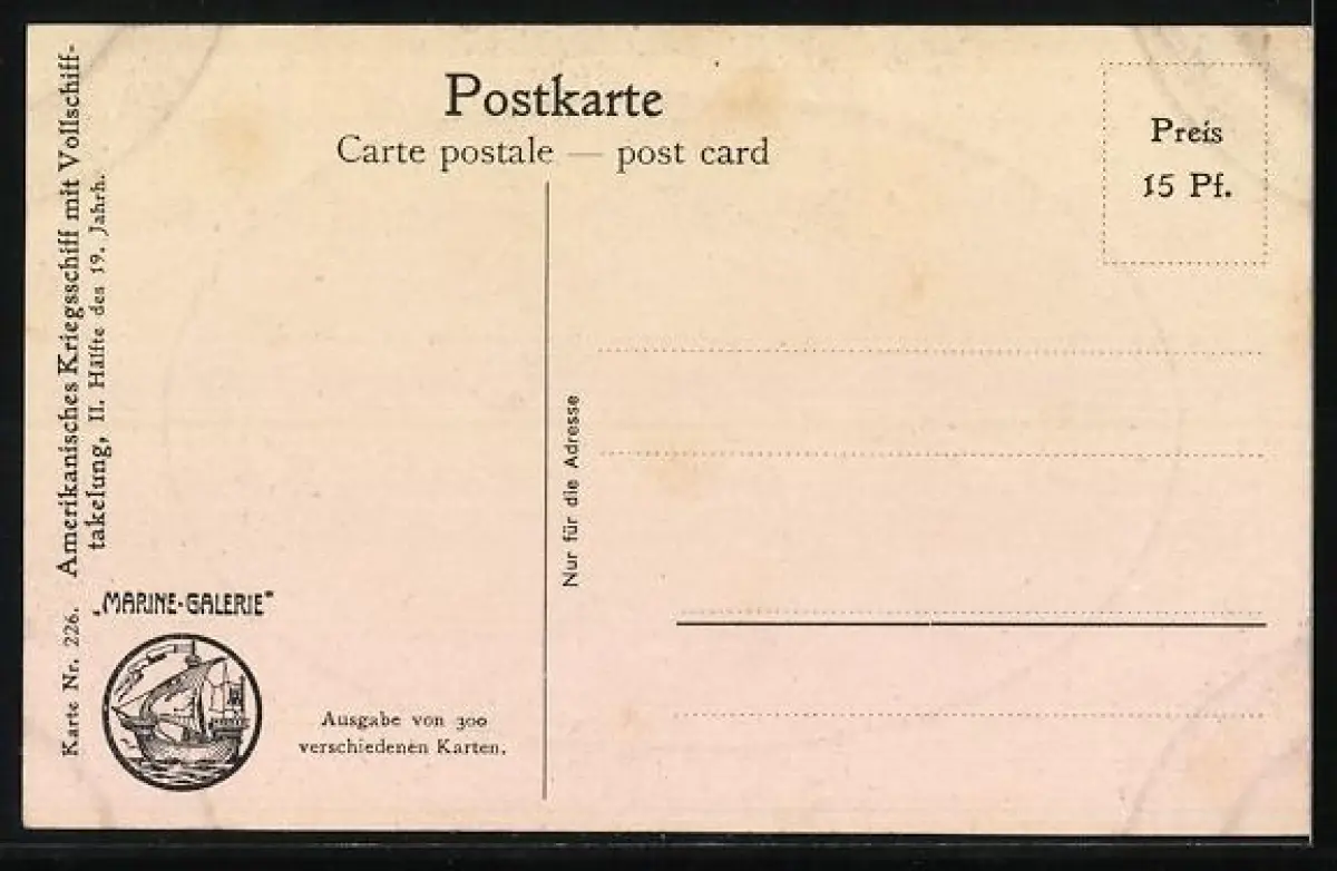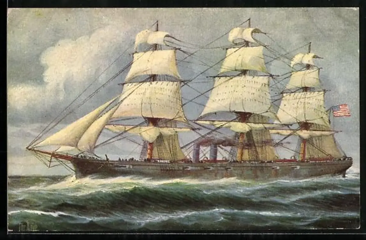 Künstler-AK Christopher Rave: Amerikanisches Kriegsschiff mit Vollschifftakelung, II. Hälfte des 19. Jahrh.