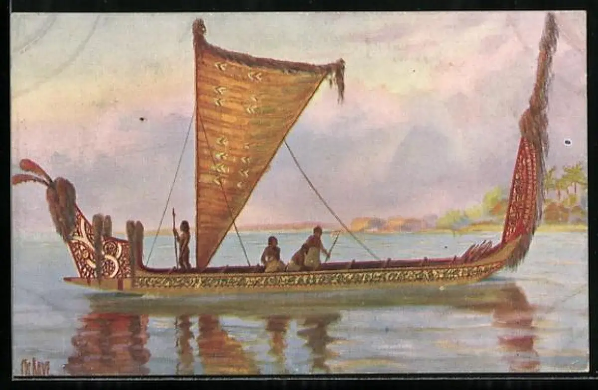 Künstler-AK Christopher Rave: Boot aus Neuseeland, Jetztzeit
