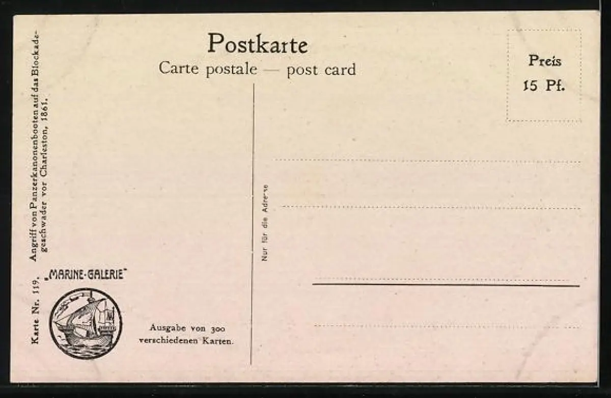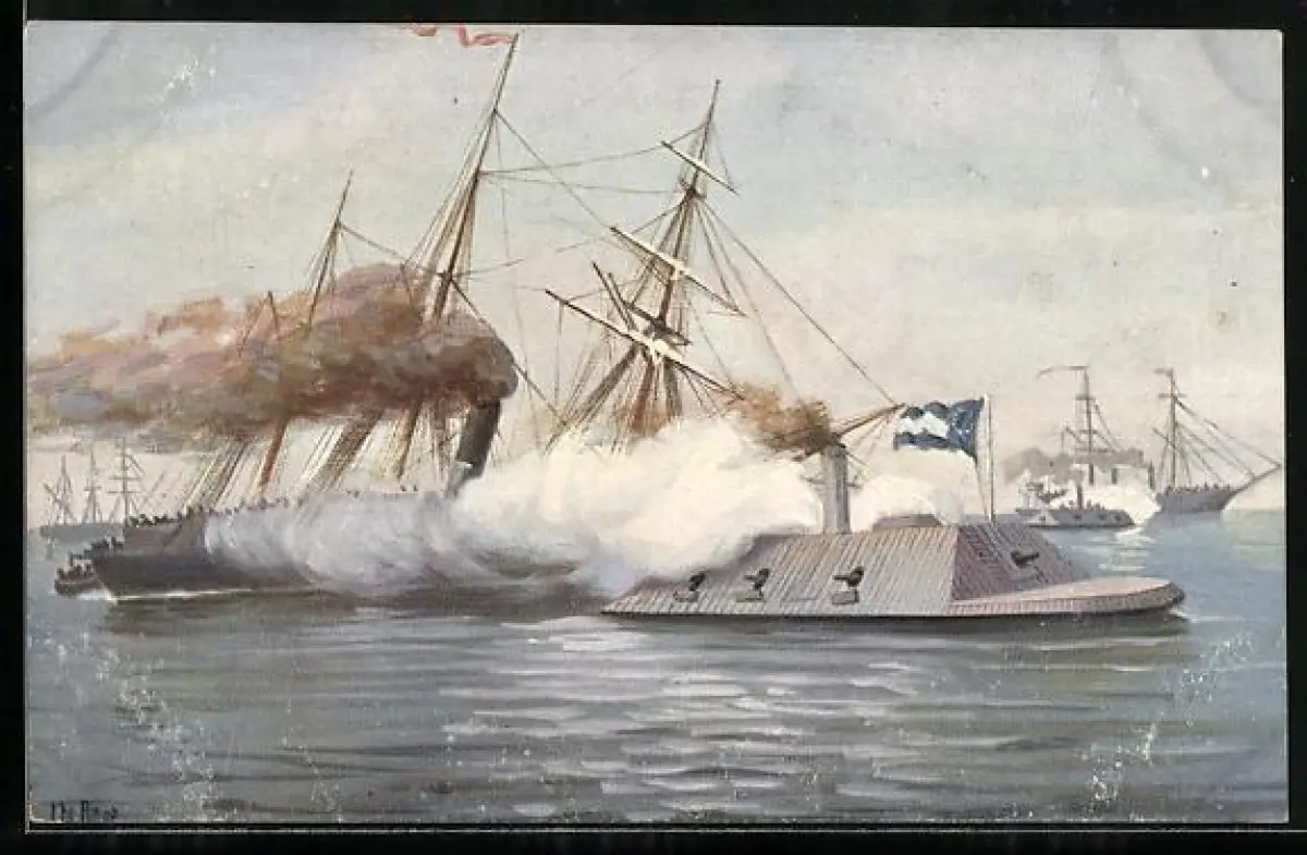 Künstler-AK Christopher Rave: Charleston, Angriff von Panzerkanonenbooten auf das Blockadegeschwader vor Charleston 1861