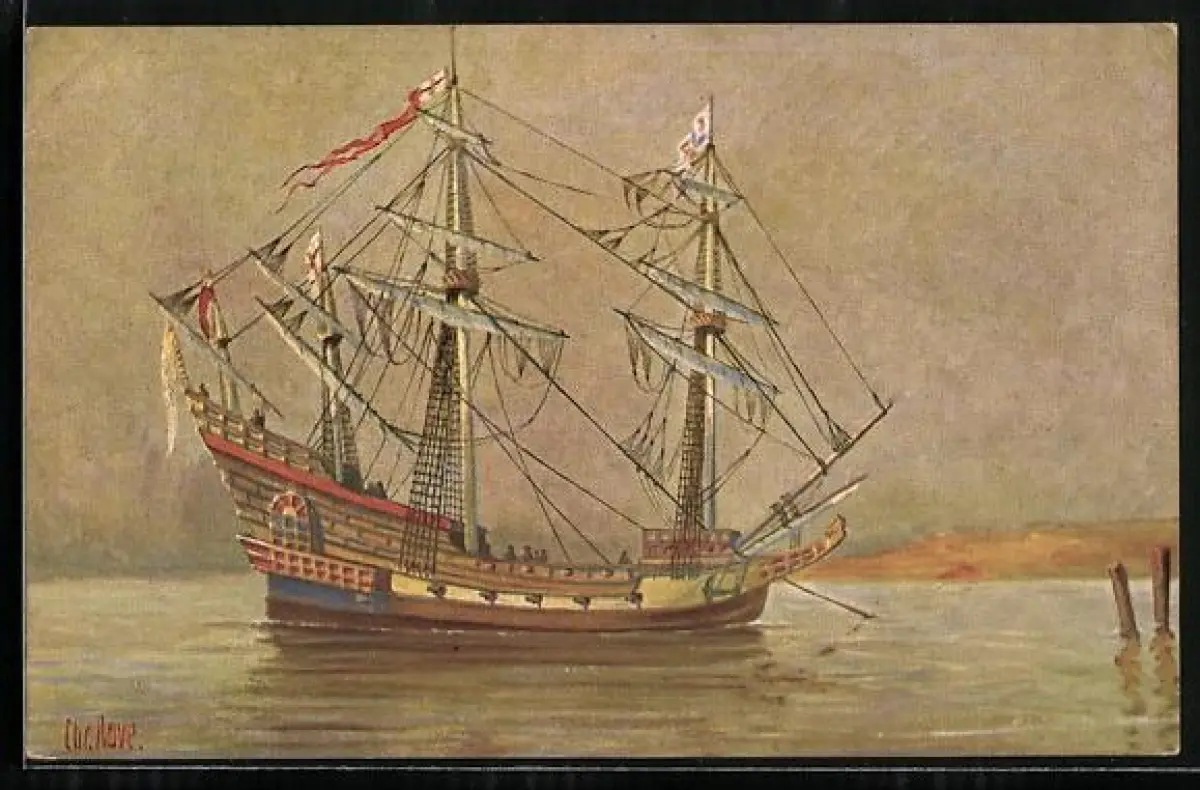 Künstler-AK Christopher Rave: Englisches Kriegsschiff vor einer Küste, 16. Jh.