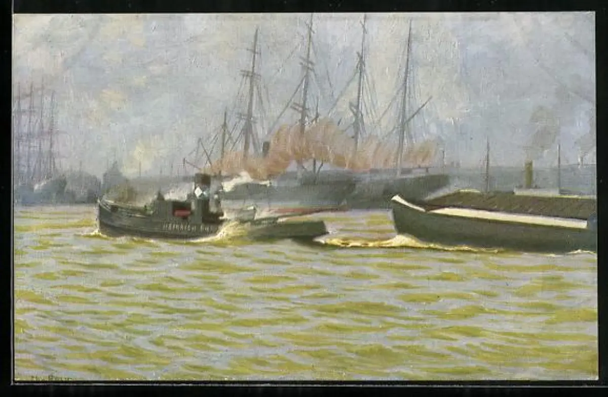 Künstler-AK Christopher Rave: Hamburg, Schleppdampfer liegen im Hafen
