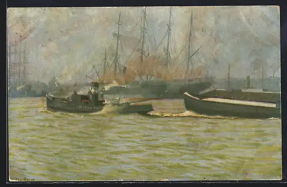 Künstler-AK Christopher Rave: Schleppdampfer im Hamburger Hafen