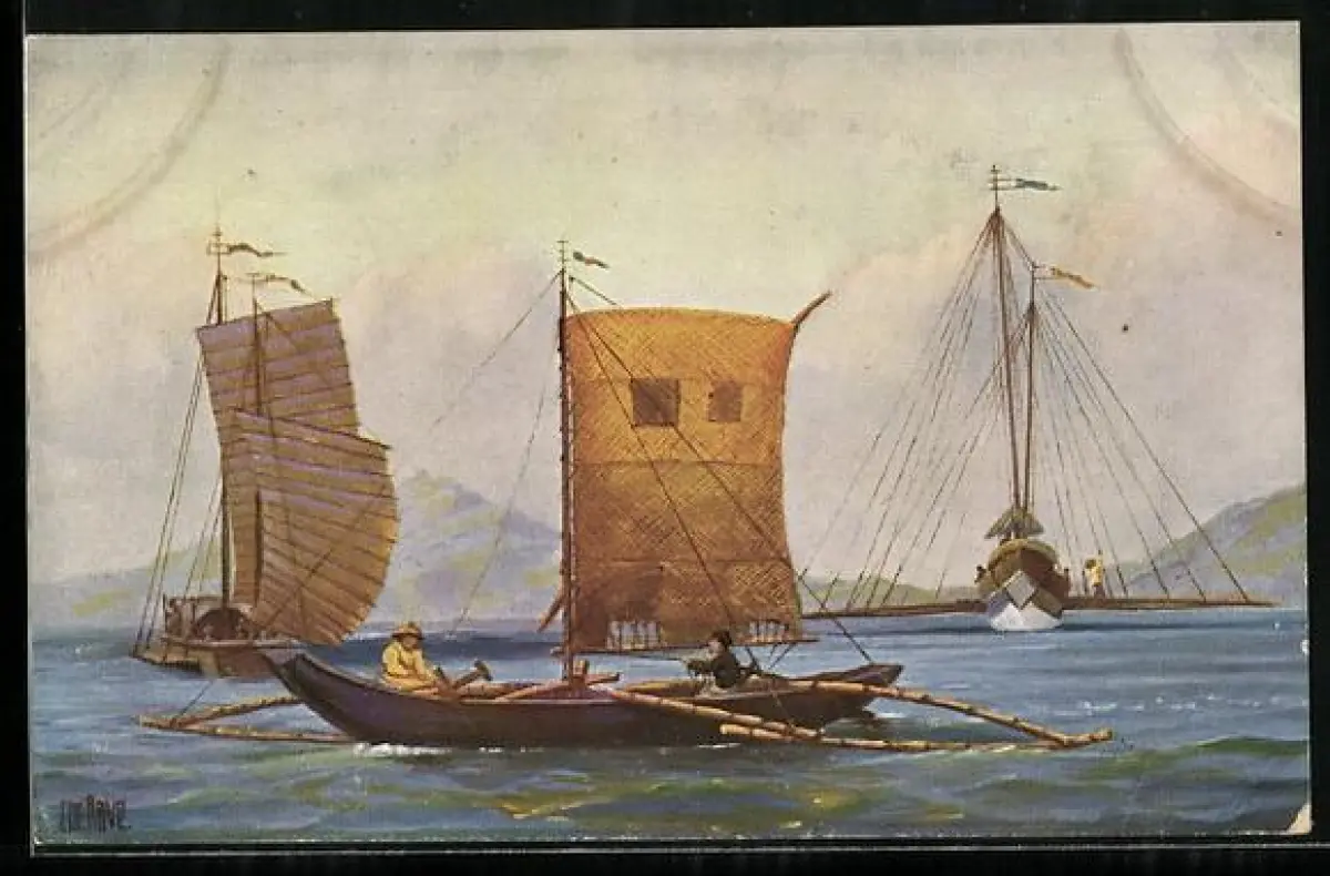 Künstler-AK Christopher Rave: Segelboot an der Küste von Manilla