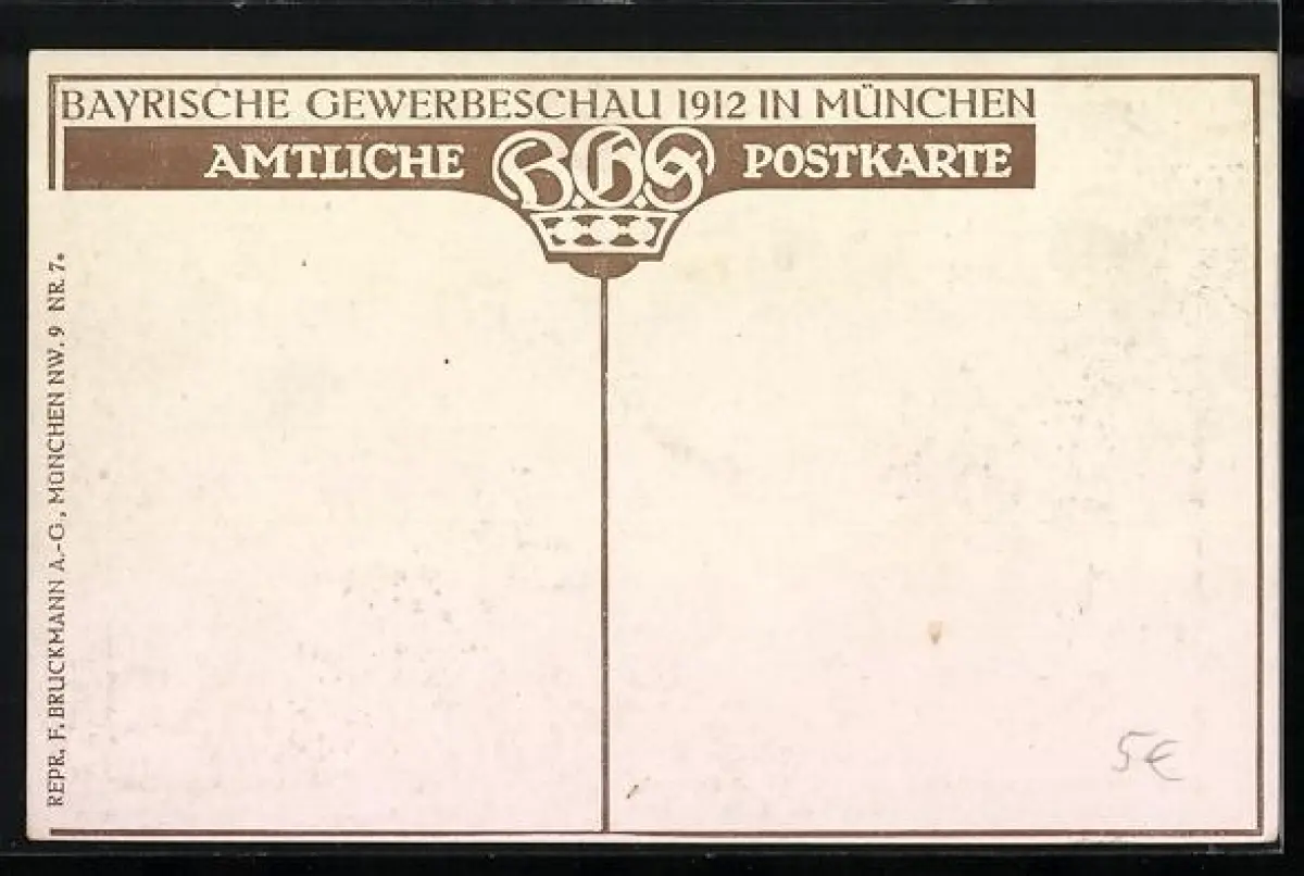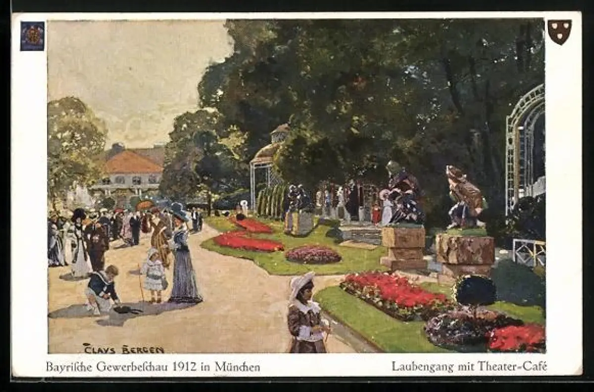 Künstler-AK Claus Bergen: München, Bayrische Gewerbeschau, Laubengang mit Theater-Café