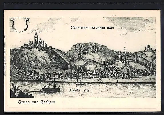 Künstler-AK Cochem, Teilansicht mit Kirche im Jahre 1650