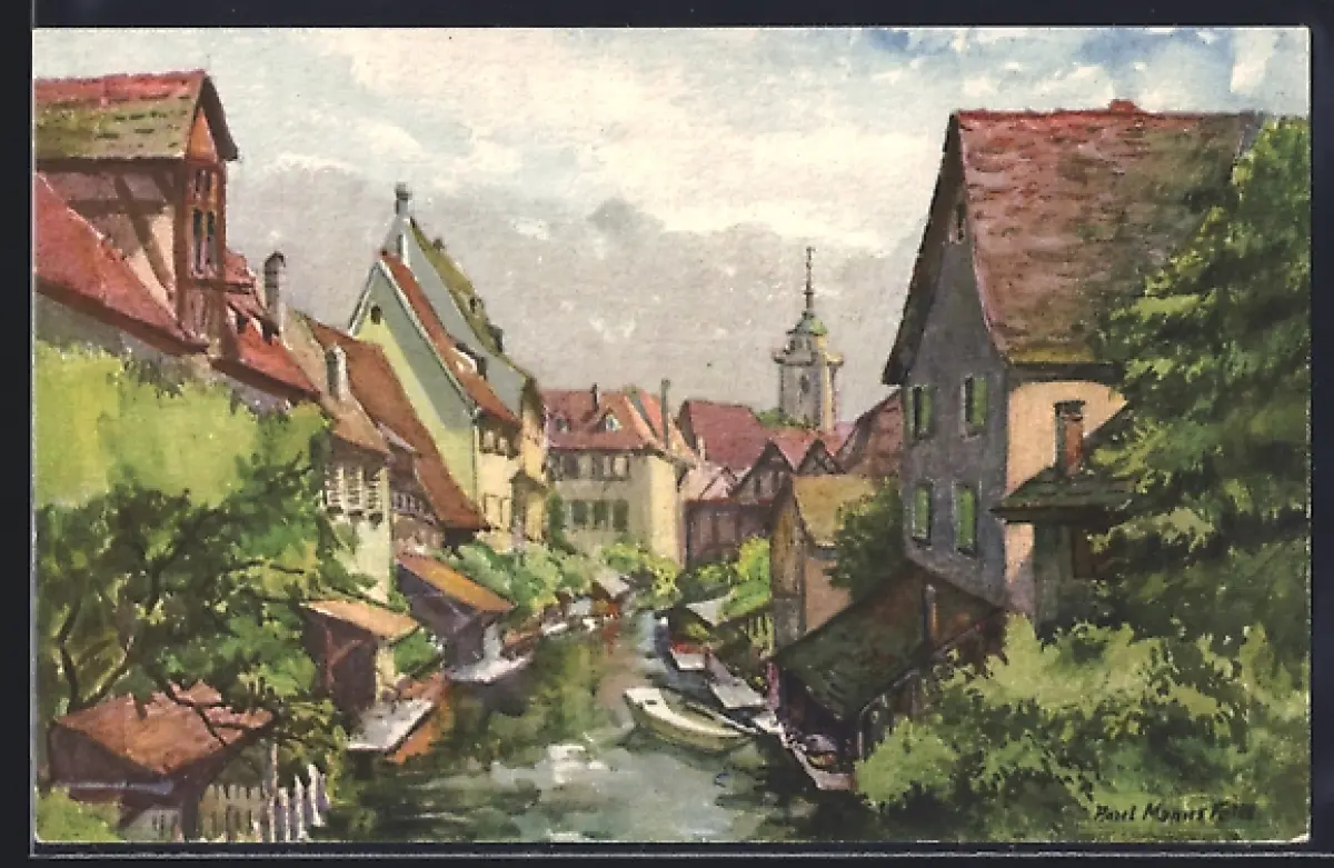 Künstler-AK Colmar /Alsace, La Petite Venise avec ses maisons à colombages et son canal pittoresque