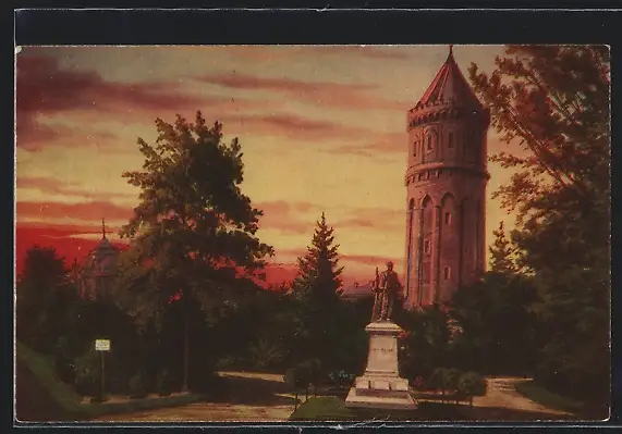 Künstler-AK Colmar i. Elsass, Wasserturm und Bartholdi-Denkmal bei Sonnenuntergang