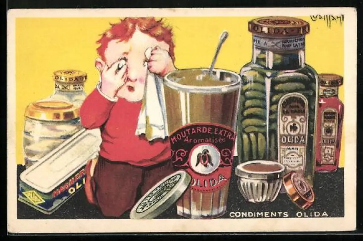 Künstler-AK Condiments Olida, Reklame, Kind zwischen verschiedenen Konserven