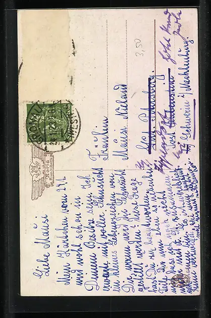 alte Ansichtskarte, gelaufen, Briefmarke entfernt, rückseitig Oberflächenschaden, guter Zustand