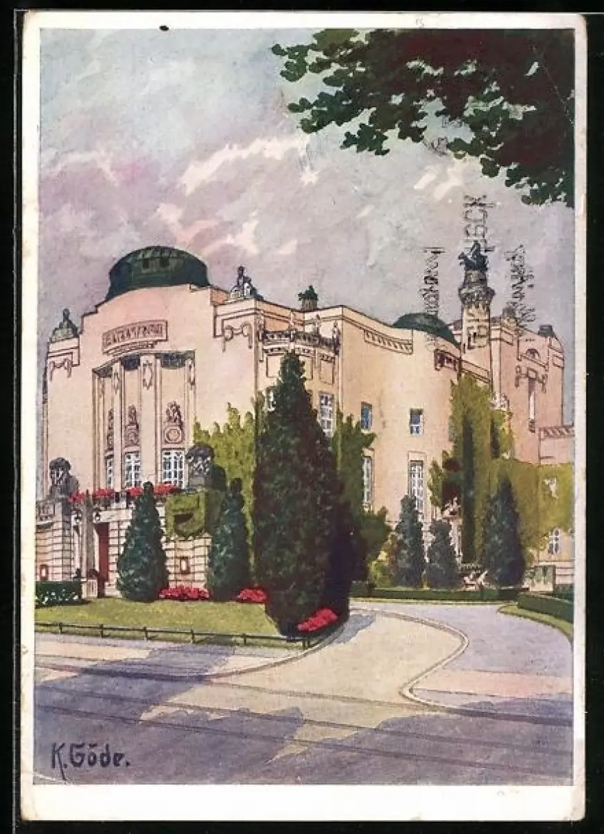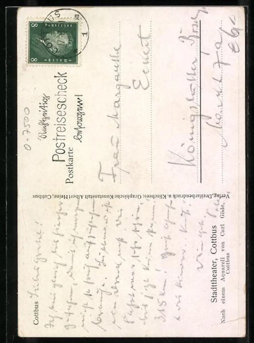 Künstler-AK Cottbus, Das Stadttheater mit Umgebung