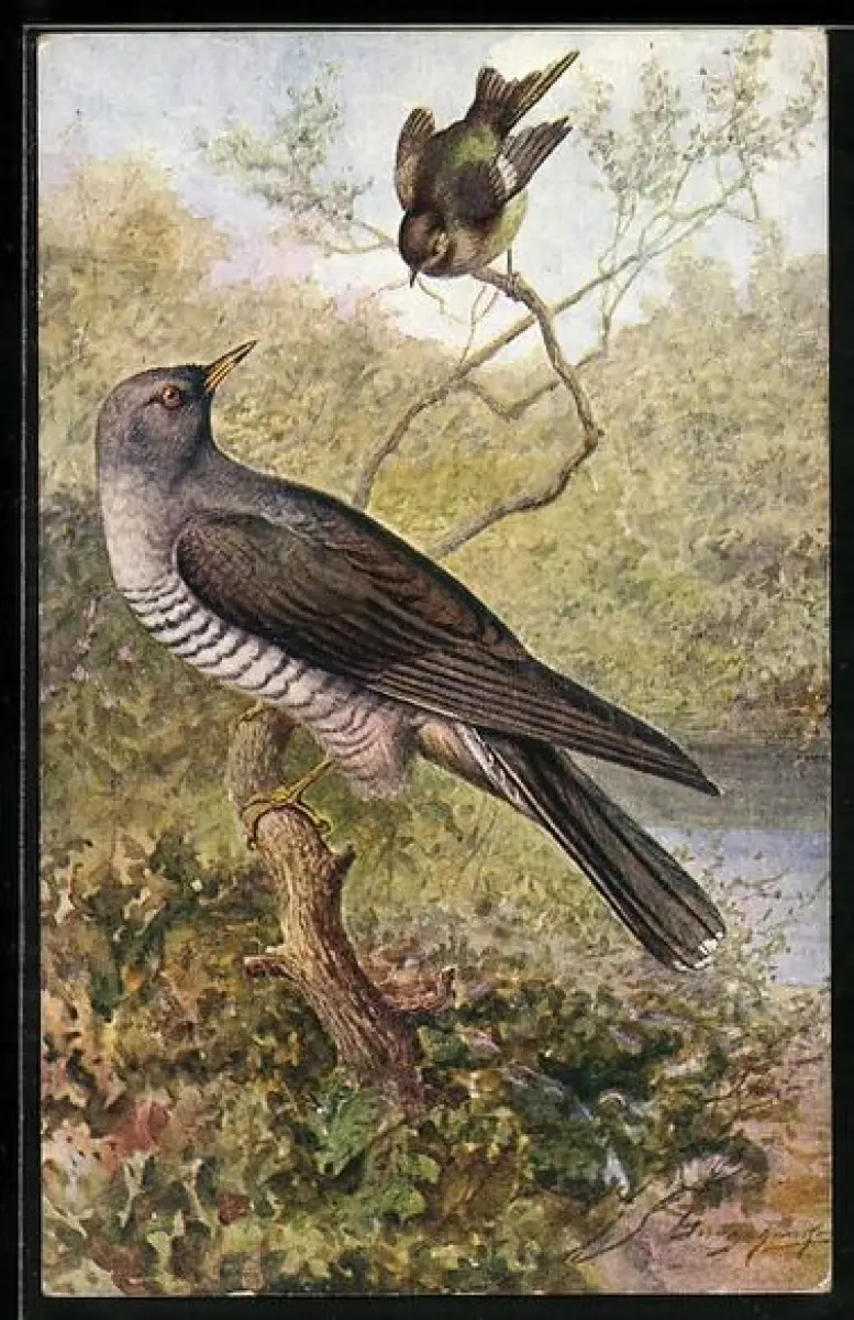 Künstler-AK Cuckoo and Wood Wren, Kuckuck auf einem Ast