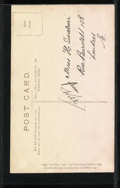 Personenbezogene Daten auf der Rückseite der Karte wurden durch blauen Textmarker unkenntlich gemacht. Die blauen Stellen sind auf die Vorderseite durchgeweicht und wirken sich negativ auf das Postkartenfoto aus