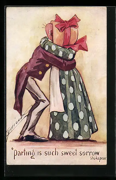 Künstler-AK Cynicus: Verliebtes Paar versteckt sich in der grossen Haube der Frau, Parting is such sweet sorrow