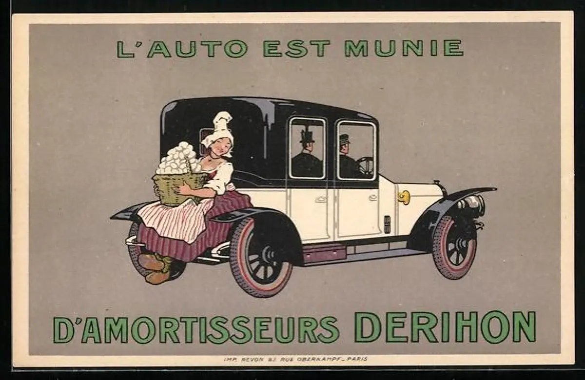 Künstler-AK D` Amortisseurs Derihon, Stossdämpfer Derihon, Bäuerin sitzt auf dem Kofferraum eines Autos