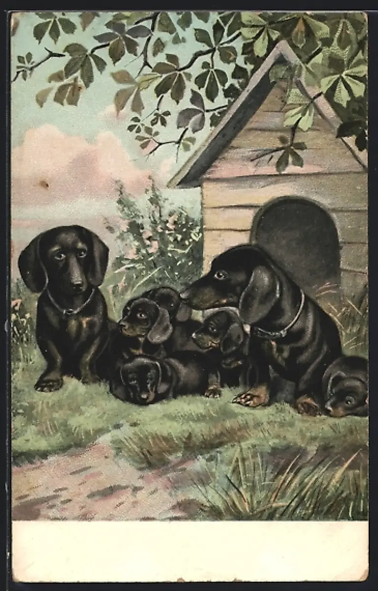 Künstler-AK Dackel mit ihren Welpen vor einem Hundehaus