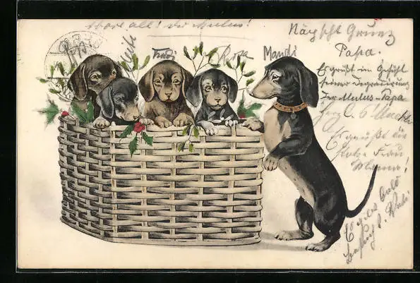 Künstler-AK Dackelmutter mit ihrem Wurf in einem Korb