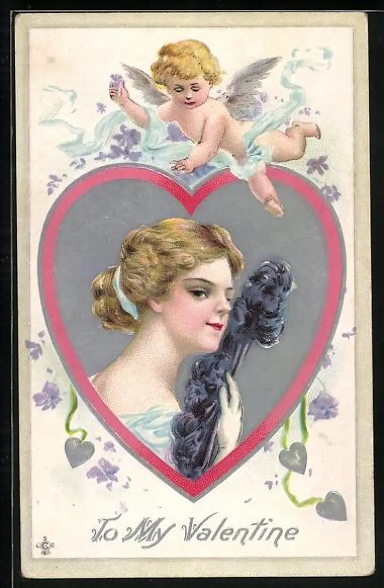Künstler-AK Dame in einem herzförmigen Rahmen, Engel mit Blumen, To My Valentine