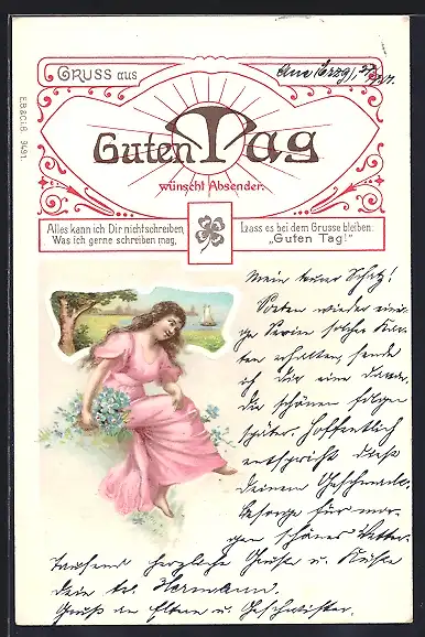 Künstler-AK Dame in rosafarbenem Kleid mit Vergissmeinnicht im Jugendstil