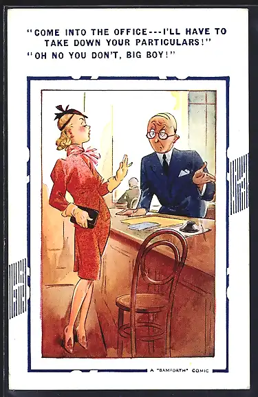 Künstler-AK Dame missversteht einen Herrn, I`ll have to take down your particulars