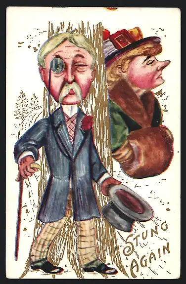 Künstler-AK Dame wendet sich von älterem Mann ab, Stung again