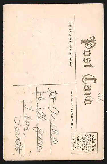 Personenbezogene Daten auf der Rückseite der Karte wurden durch blauen Textmarker unkenntlich gemacht. Die blauen Stellen sind auf die Vorderseite durchgeweicht und wirken sich negativ auf das Postkartenfoto aus
