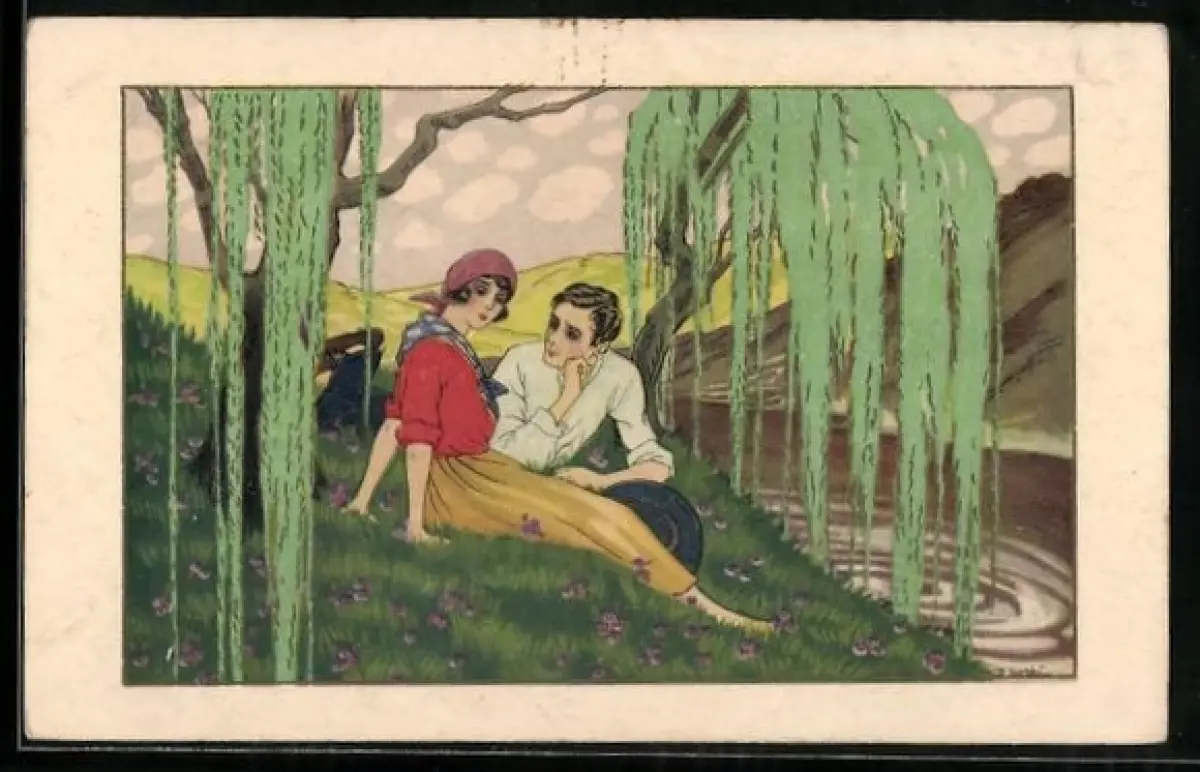 Künstler-AK Dario Gobbi: Mann und Frau sitzen am Ufer unter Trauerweiden
