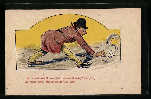 Künstler-AK Das Kraut, das Du rauchst, das duftet so fein, Mann findet Zigarette