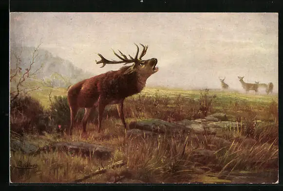 Künstler-AK Degi Nr. 1210: Oktobermorgen, Röhrender Hirsch, Ölgemälde-Imitations-AK