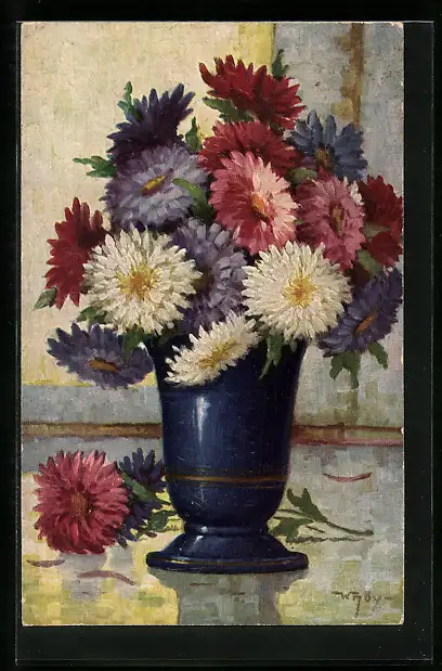 Künstler-AK Degi Nr. 1305: Dahlien in der Vase, Ölgemälde-Imitations-AK