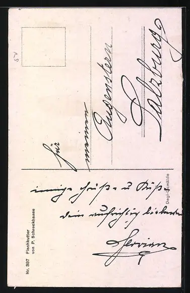 Personenbezogene Daten auf der Rückseite der Karte wurden durch blauen Textmarker unkenntlich gemacht. Die blauen Stellen sind auf die Vorderseite durchgeweicht und wirken sich negativ auf das Postkartenfoto aus