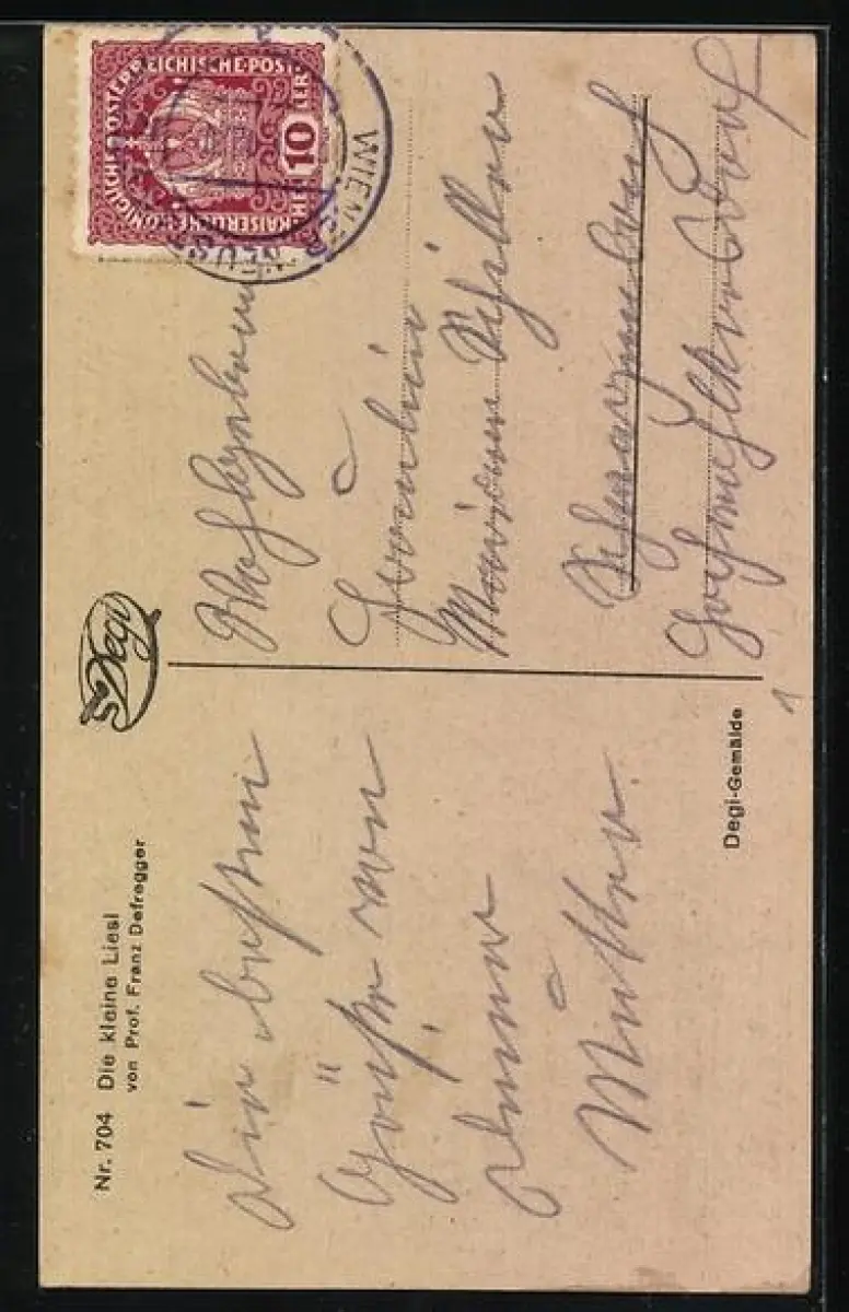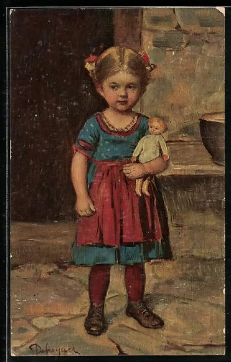 Künstler-AK Degi Nr.704: Die kleine Liesl - Mädchen mit ihrer Spielzeugpuppe im Arm