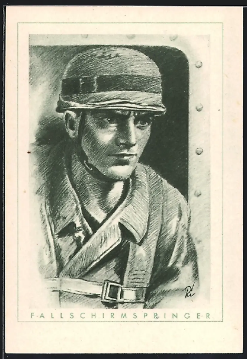 Künstler-AK Der Fallschirmjäger, Stahlhelm