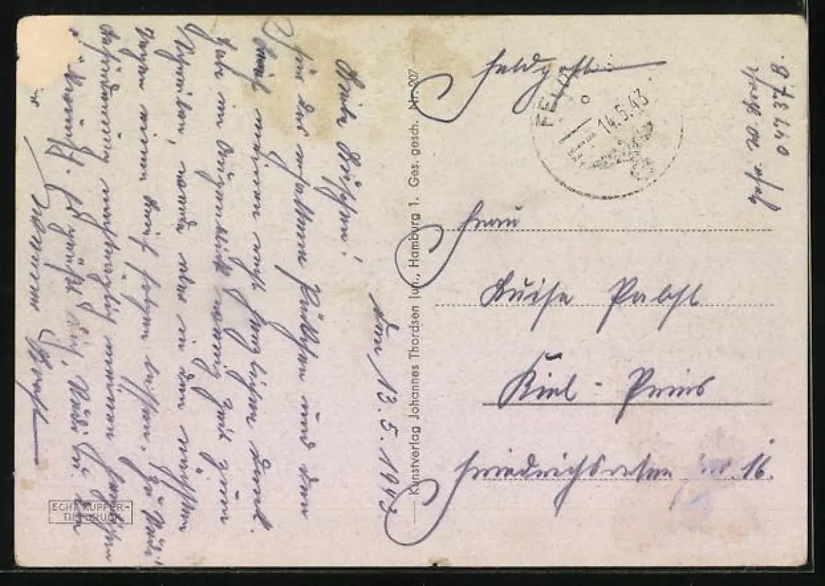 alte Ansichtskarte, gelaufen 1943 als Feldpost, Eckknicke links oben und rechts unten, kleiner Einriss unten mittig, sonst guter Zustand
