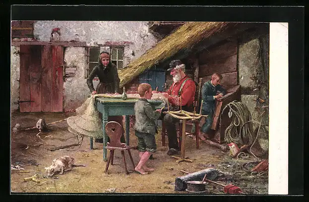 Künstler-AK Der Netzflicker mit seiner Familie bei der Arbeit