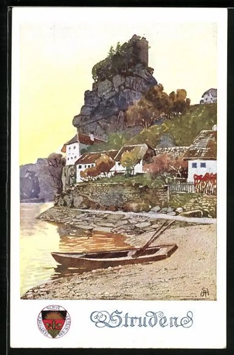 Künstler-AK Deutscher Schulverein Nr. 281: Struden, Blick zum Ort, Ruderboot