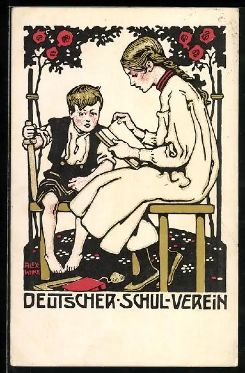 Künstler-AK Deutscher Schulverein Nr., sign. Karl Alex Wilke: Grosse Schwester unterrichtet Bruder